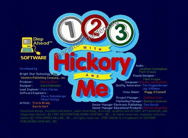 1994, the year 123 with Hickory and Me was released on Windows 3.x, as well as Mac. Made by Bright Star Technology, Inc. and published by Western Publishing Company, this educational game is available for free on this page.
