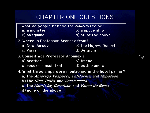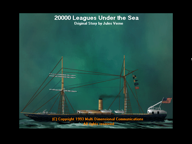 In 1995, SoftKey International, Inc. publishes 20,000 Leagues Under the Sea on Windows 3.x. Also published on Mac, this educational game is abandonware and is set in a game show / trivia / quiz, reading / writing, licensed title, steampunk and interactive book themes.