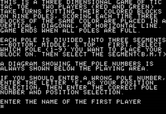 Share your gamer memories, help others to run the game or comment anything you'd like. If you have trouble to run 3-D Tic-Tac-Toe (Apple II), read the abandonware guide first!