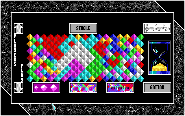 Simple solo or two-player brainteaser developed by Russian company GAMOS. Also known as Filler, which describes the game principle fairly well. You have to fill a board of different colored tiles starting from your corner by choosing from seven colors. The color you choose determines which tiles you will gain. You can't choose the color your opponent has selected in his last move.