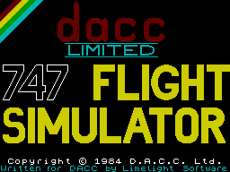 747 Flight Simulator (aka Simulador de Vôo) is a video game published in 1985 on Commodore 64 by DACC Limited. It's a simulation game, set in a flight, real-time and vehicle simulator themes, and was also released on Atari 8-bit, BBC Micro, Dragon 32/64, Electron and ZX Spectrum.
