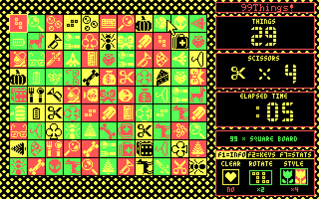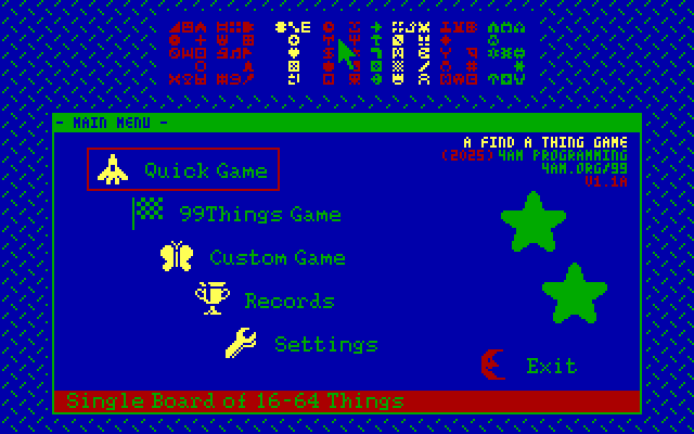 Here is the video game “99Things”! Released in 2025 on DOS, it's still available and playable with some tinkering. It's a puzzle game, set in a hidden object theme.