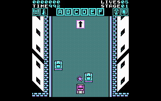 Core Design's computer conversion of SEGA's top-down shoot'em up Action Fighter for the Sega Master System and Mega Drive. Actually quite a good conversion of this fun little game. In Action Fighter, you start your mission as a motorcycle and must collect power-ups in order to become the Porsche, and finally the flying Porsche/Jet-fighter. In addition to this novel concept of driving & flying combination, Action Fighter also contains very challenging end bosses on every mission. Your mission orders come straight from the president, lending a bit of (albeit fake) urgency to the game.