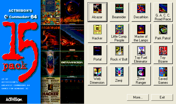 Activision's Commodore 64 15 Pack (aka C-64 Spielesammlung, fünfzehn C64-Spiele) is a video game published in 1995 on Windows by Activision, Inc.. The game is set in a compilation / shovelware theme.
