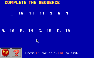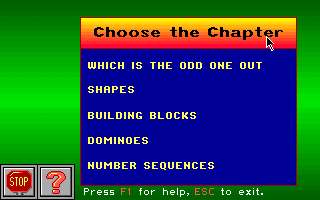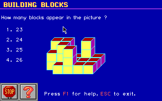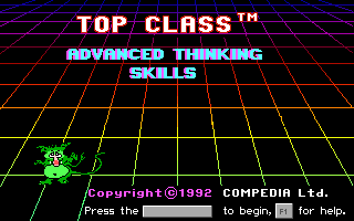 Advanced Thinking Skills is a fun edutainment / puzzle game released as an entrant in Compedia's short-lived Top Class series. The game is a collection of five mini-puzzle games commonly used on psychometric exams and IQ test: Odd one out (find shape which is different from all the rest), Shapes (find a shape that completes the sequence), Building Blocks (count the number of blocks in the picture), and Dominoes and Number Sequences (choose a domino / number that completes the sequence).