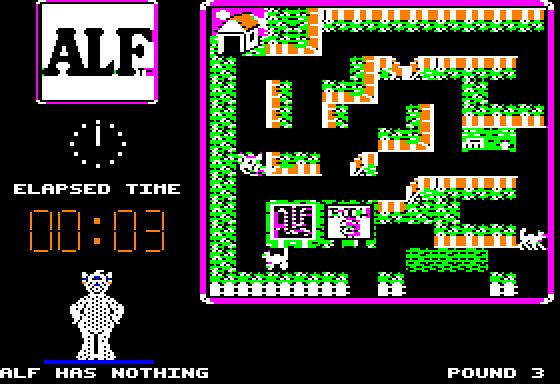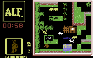 As Alf the good-hearted alien, your goal is to around the neighborhood collecting pizzas while avoiding cats and the man of the household. Not unlike Pac-Man, except there is a lot more to do in each maze. For instance, in some levels you have to find parts to your spacecraft, and most levels are quite large, spanning 2 or even 3 screens.