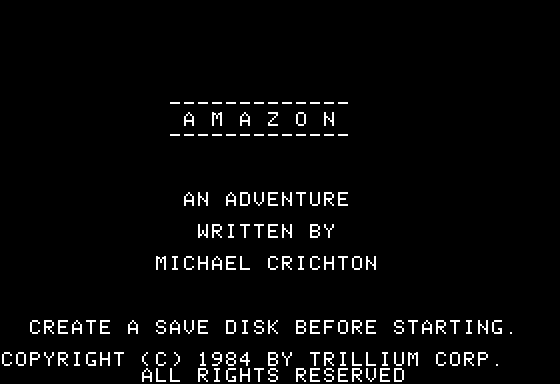 Contrary to what many people think, this game isn't based on any actual story by Michael Crichton. It's an original game on which Mr. Crichton worked even before Telarium contacted him. If you compare it to similar games from the same period, Amazon stands out with its "story-driven" plot, which somewhat compensates for the CGA graphics and Telarium's ackward parser.