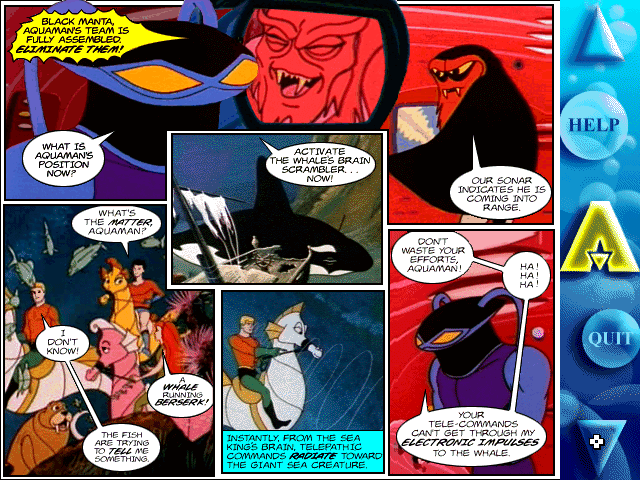 Aquaman: War of the Water Worlds is a video game published in 1996 on Windows by Inverse Ink. It's an adventure game, set in a fantasy, licensed title, interactive book and tv cartoons themes, and was also released on Windows 3.x and Mac.