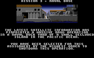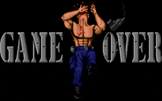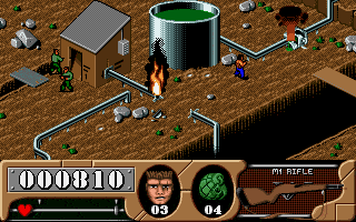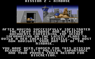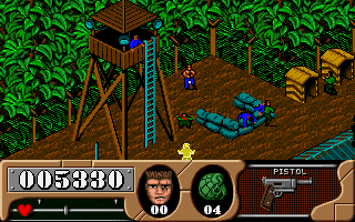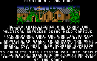 Nothing special here, but the game has vibrant VGA graphics, nice MOD music and pretty tough levels. In a plot that is similar to dozens (if not hundreds) Rambo-style games before, Arnie 2 casts you as a beefy commando who must blast his way through 4 increasingly difficult levels, each with its own buildings, types of enemies, and objectives. The four levels are: chemical weapons factory, airbase, naval base, and finally a POW camp where you must rescue POWs in addition to blasting everything else in sight.