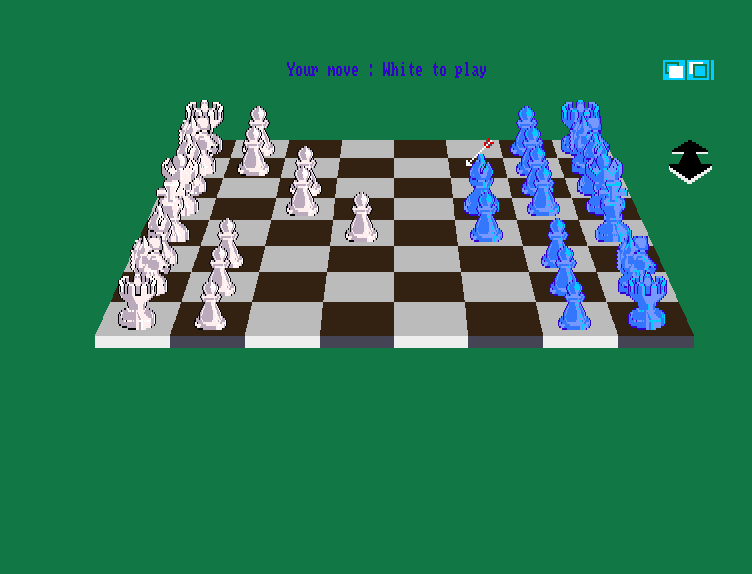 To start with what is good: I like the way the pieces move. Grabbing and moving a piece in AoC feels way more fluid than it does in a number of other stronger chess programs from this era. A lot of 16-bit chess programs with an isometric view of the board presents some issue with moving the pieces. Both picking up and dropping a piece is just awkward in Psion. Piece movement in the Whittington programs (Chess Champion 2175 et al) is jerky and slow. The click-click Colossus X is just a pain. Sargon III is fluid, but with no visible feedback until you actually finished your move. The pieces in AoC is easy to pick up and moves like a dream. I can only guess, but I imagine that being an Amiga only title this program makes good use of the Amiga graphics hardware, like using sprites for the pieces, and to good effect. Also, the 3D board doesn't look too bad. The default view easily feels cluttered, but if you tilt the board towards you it is easy to make out where the pieces are. Although I would prefer a plain 2D option, and the 3D board in CM2000 still looks better.