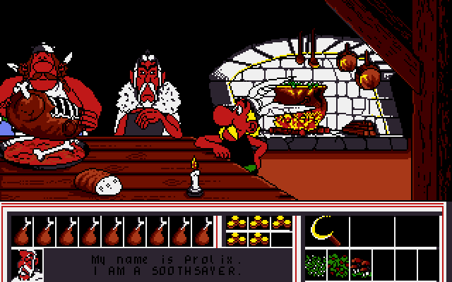 Gameplay follows for the most part a typical platform formula: fight the Romans and hunt the wild boars, etc. But as with most Coktel games, Asterix also contains non-action sequences, such as the fun part where you mix the ingredients and test the potion on either Getafix or a captive Roman, and dice game you can play against the soothsayer or Romans in the camp. The money you win from the game is necessary to buy items and potion ingredients.