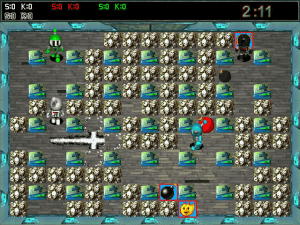 One player controls one little bomberman; his objective is to blow up (with bombs, yes) all the other little bombermen on the screen, who can either be controlled by real human opponents or the computer AI. Your basic bomberman can drop one bomb at a time, and the range of the lethal explosion from said bomb stretches only a couple of squares wide and high on your gridded gamescreen. As you play on, and blow up destructible wall tiles, powerups appear that increase the amount of bombs you can lay at one time, as well as the length of the explosion, and several other handy features that hope to give you the upper hand over your opponent.