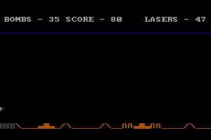 As the in-game instructions make clear: "your mission is to destroy the Apple Computer manufacturing plant. You are alloted 35 bombs and 60 lasers. There are Apple-owned fighters trying to stop you, you must destroy them with your lasers. If you get hit by them then you are destroyed. If you go out of the atmosphere (the blue line), then you loose [sic] all control except laser and bombs, and your ship will begin falling. Drop bombs on all structures and you will get points. The Apple Plant (shown below) is worth the most points. If your score is high enough after round one then you are ready to face round two."