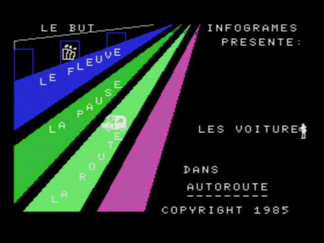 Here is the video game “Autoroute”! Released in 1985 on MSX, it's still available and playable with some tinkering. It's an action game, set in an arcade theme.