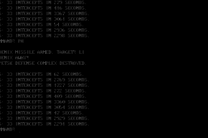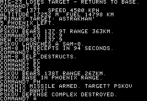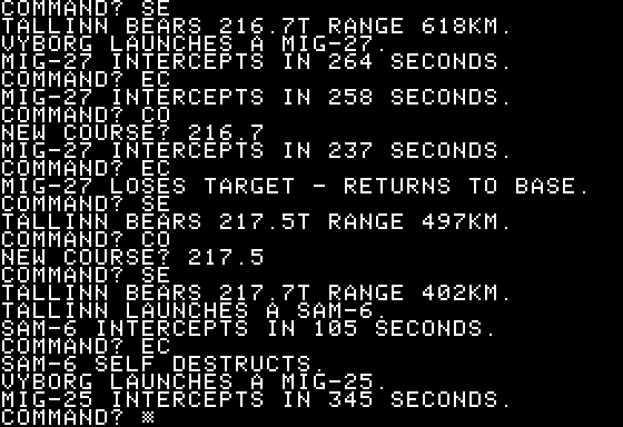 You must fly through stiff Russian defenses to the target city, bomb if and return home. Your computer controls the soviet MIG fighters and SAM's, and you must rely on electronic counter measures and self-defense missiles. Similar to other games of the era, B-1 Nuclear Bomber was coded entirely in BASIC. But unlike classic BASIC games such as Dan Bunten's amazing Cartel$ & Cutthroat$ that push the envelope of the language, B-1 Nuclear Bomber is one of the worst of the bunch.