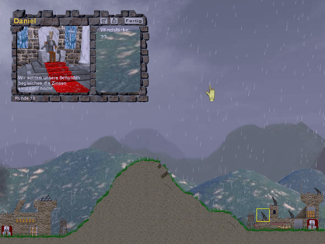 Here is the video game “Ballerburg”! Released in 2003 on Windows, it's still available and playable with some tinkering. It's a strategy game, set in a turn-based, artillery and fangame themes.