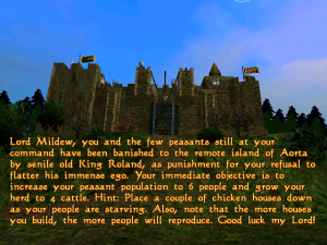 The innovative slant on Beasts and Bumpkins is that your population must grow by "natural" means - you don't build or buy new villagers, you need a frisky man and woman to nip off into a hut for a bit of nookie to get a baby, which then may grow into a boy or girl, assuming the wolves don't get it first. If you want a soldier you have to send a young man to a guard tower and train him for cash (which you raise by charging for water and food). If you later want a villager back, you can demob the footman back to farm duty. The game clock runs continuously - you can't pause to give orders - and time is split into four seasons which in turn are split by night-time phases. It takes a few seasons for babies to grow to adults, and an adult may live for four or five game years, depending on food and water supply. As long as you provide food, housing, water, and you don't get attacked, you should expand nicely by surviving on wheat, bread, cattle and milk. Wheat is planted in spring and harvested in the autumn, cows can be lured into fenced fields where they can be milked.