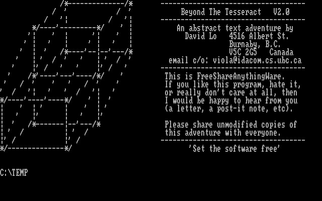 Beyond the Tesseract is a video game published in 1988 on DOS. It's an adventure game, set in an interactive fiction, sci-fi / futuristic and puzzle elements themes.