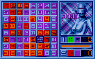 If you want to win a round this way, you have to play against a computer: Once you have set the parameters in the main option menu a board appears on the screen with 64 pieces. The aim is always to find a piece with the highest value. The values are:1 to 11 and -1 to -10. The latter minus values are for the red pieces (or black in CGA.) After a piece has been selected from a certain row or coloumn, your opponent must choose his next piece from the same row or column, i.e. if you are clever you can force your opponent to make unfavorable choices. Get it?