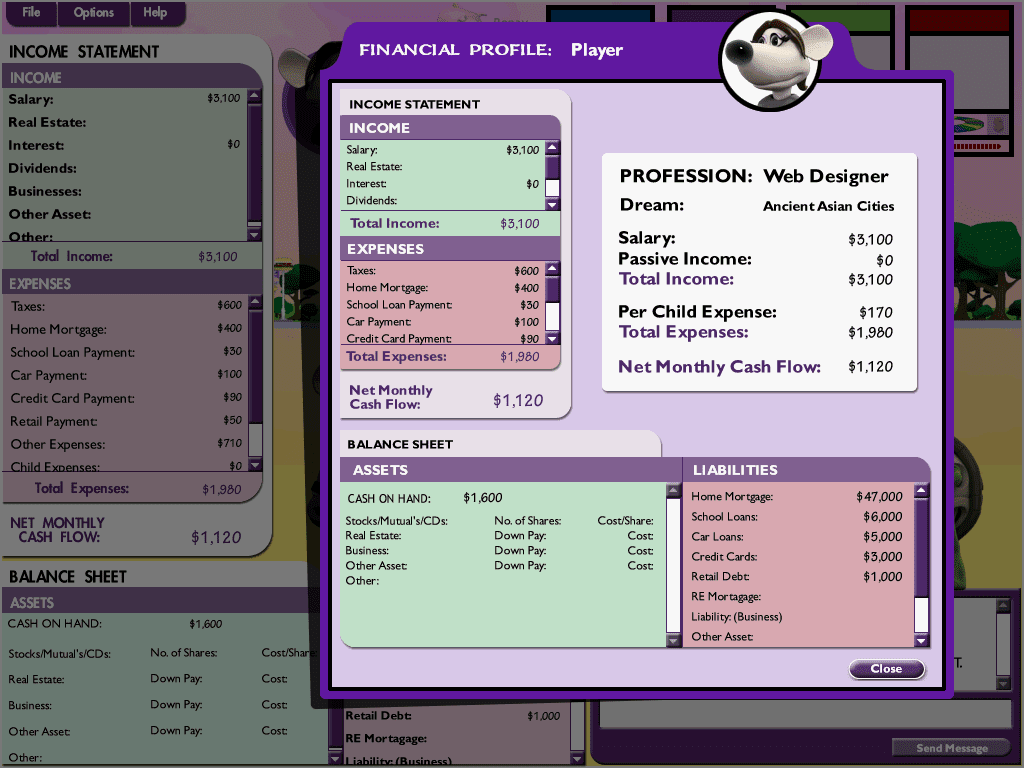 Here is the video game “Ca$hflow: The E-Game”! Released in 2003 on Windows, it's still available and playable with some tinkering. It's a strategy game, set in a board / party game, turn-based, licensed title and full motion video themes and it was released on Mac as well.