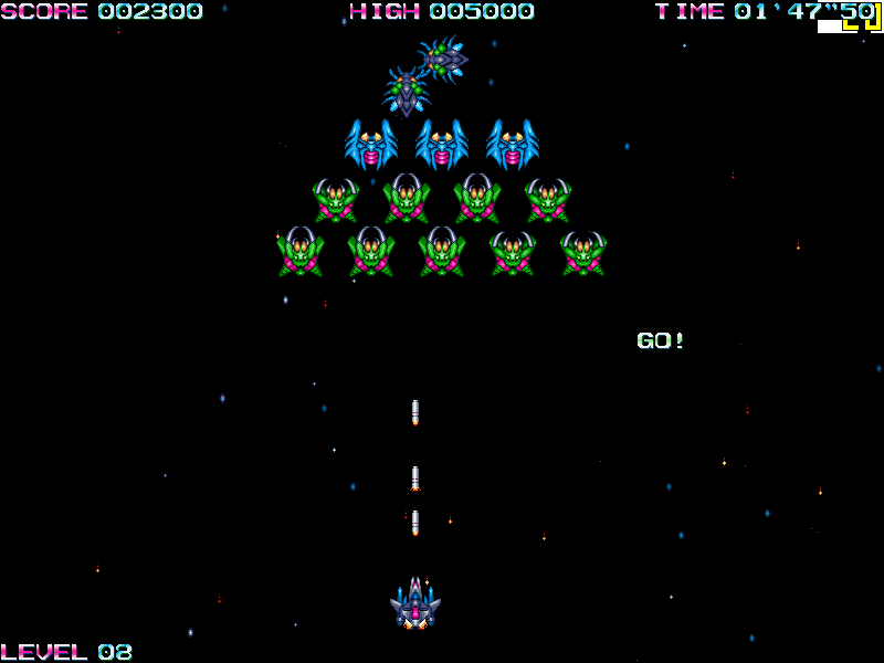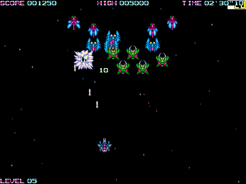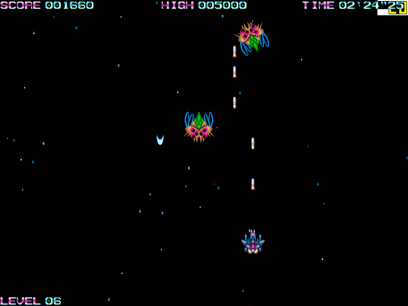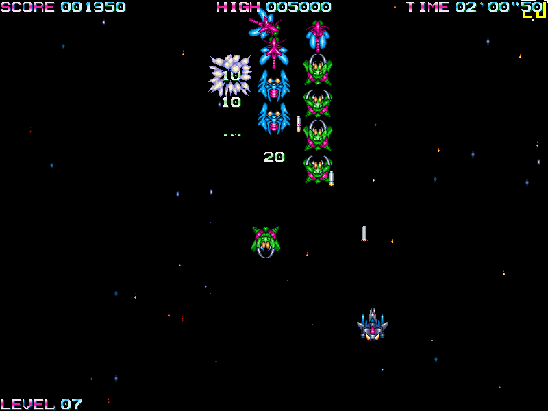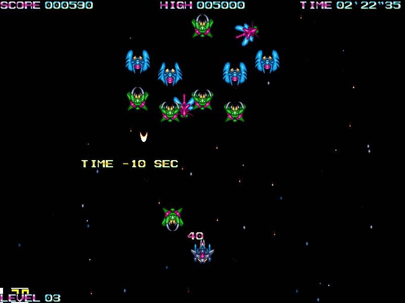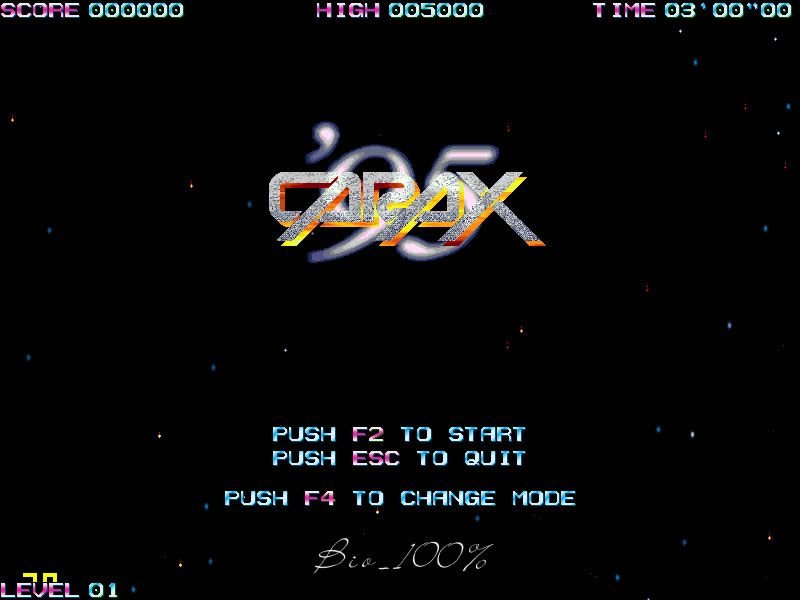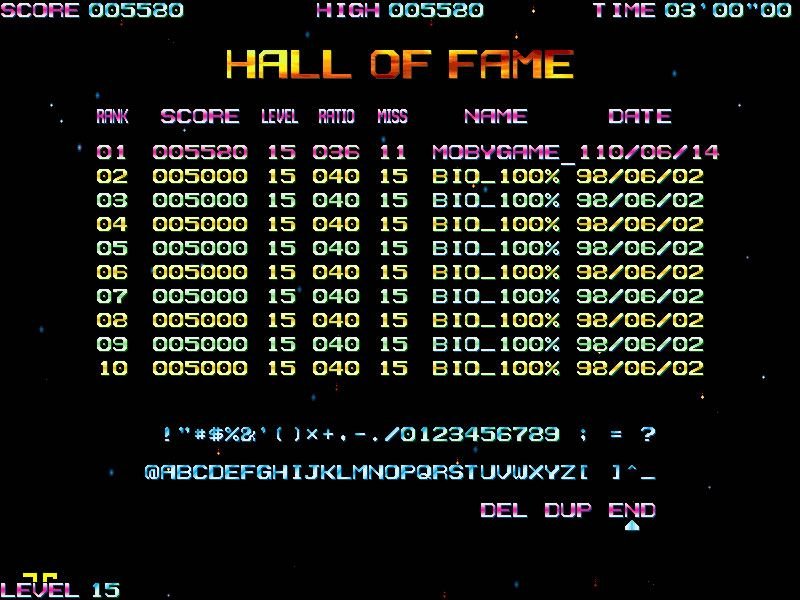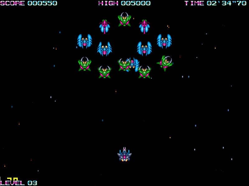 Carax '95 is a fun retro-style vertical shooter designed by Bio_100%, one of Japan's oldest freeware design group (they also developed WinDepth, reviewed on this site). Carax '95 resembles Galaxian and Space Invaders, in that you basically wait at the bottom of the screen while waves of enemy ships fly toward you. However, the game uses an innovative and challenging mechanic: instead of a limited number of lives, you have unlimited lives in this game. But you have only 3 minutes in which to score as high as possible and to evade enemy fire: each hit will cost you 10 precious seconds. On the other hand, if you manage to complete a wave with a hit-ratio of 70% of better, you will be rewarded with more game time on the timer. This means it is essential to accurately aim your shots - holding down the fire button won't get you far in this game.