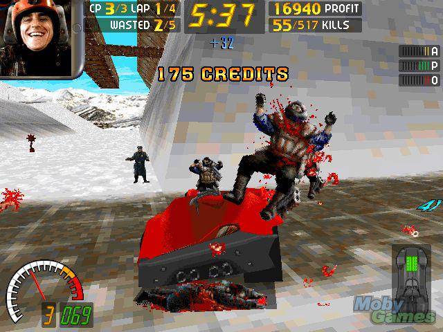 There are three different ways to win a race: you can win it outright, by completing X number of laps; or by destroying all of your opponents; or killing every pedestrian in the environment (the latter is unlikely, considering there can be more than 500 in a race). For particularly inspiring deaths, you may be awarded bonuses for "extra style" or "artistic impression." The tracks have a lot of jumps and hills, and the inevitable flips and spins can result in a "cunning style bonus." Power-ups range from the typical (full repairs, extra time) to the bizarre (a "jelly" suspension or the "pedestrian extro-bastard ray").