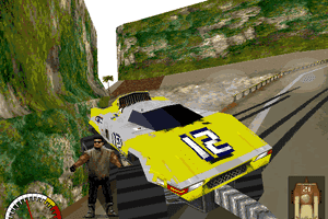The structure of Carmageddon is like most arcade race games - run a race, get money and upgrade your car. Each race features six cars. There is a timer that counts down; when it hits zero, the race is over. Unlike most race games, the way you increase the timer is not by reaching different stages, but instead by damaging other cars, or more often than not, running over pedestrians. If the thought of killing people makes you squeamish, pretend the guys in suits are your ex-boss, the men or women in bathing suits are Calvin Klein models, the punker dudes are whiny Gen-X'ers, and perhaps most gratifying of all, the guys in white suits are those dancing idiots in the Intel MMX commercials. Play that funky music, disemboweled boy.