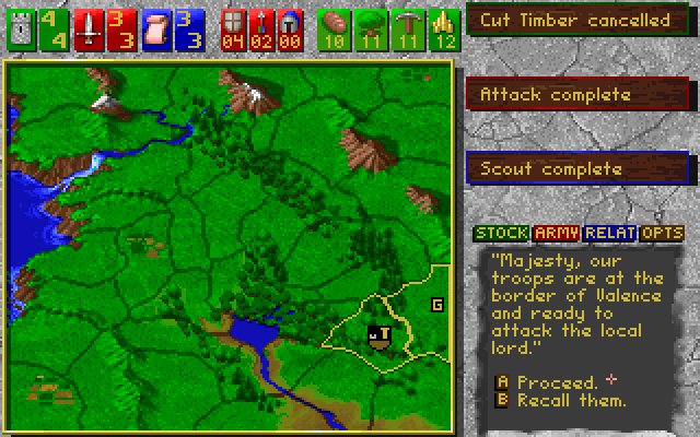 I find the strategy element of this game to be very engaging. You play the game by assigning advisors to tasks. There are three categories, administrative where you gather resources and build castles, military where you recruit units or sabotage neighbors, and diplomatic where you improve relations, scout territories and spy. Each successful completion of a task contributes to an increase in the number of advisors you have. Each task requires a minimum of advisors, so you can't recruit knights until you have at least 6 military advisors. You can also lose advisors from failing at a task. You can also mix and match advisors to complete tasks faster. This is especially useful for castle building, which is the most time consuming.