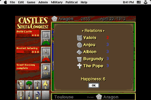 Castles II is, like its predecessor, a long game. But you now have a concrete measure of your progress: the points system. Most actions in the game yield points, some (e.g. conquering a province or wiping out a noble completely) more than others. You have to reach 7,000 points to petition the Pope for the throne, and then you have to maintain those points for 4-5 computer months to win the game. Castle building is more efficient and easier to deal with. You can even set up pre-made castles on file so that you can place them quickly. Battles are set in a full alternate screen with the ability to place and command each unit, a welcome change from the passive, watch-it-unfold battles in the first game.