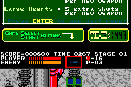 While most other platform games feature "typical" weapons such as the rifle, and standard go-to-the-right-forever-and-climb-some-ladders level design, Castlevania gives you a cool Indiana Jones-style whip that is useful for more than plain monster-kiling. The levels are very expansive, and navigable in more than one direction: sometimes you will be walking left, then up the ladder, then over the chasm (using your trusty whip to swing from ceiling hooks), then to the right, then inside the doors and so on. This makes navigating the levels very "realistic" -- the first three levels comprise one castle, then you are tossed into the dungeons, from where you finally emerge to enter the second castle, where you are greeted by Frankenstein himself at the entrance.