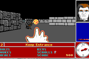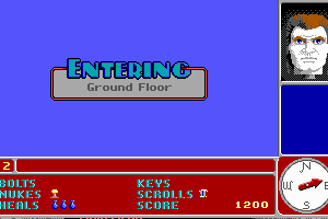 3-D raycasting and texture mapping blew most other games of the time out of the water. All of the sprites and textures are cartoonish and pleasant to look at. The protagonist inexplicably has what looks like a flat top mullet... I'm willing to bet he was wearing Zubaz too. The environment is sparse of defining features, but there is a text line that tells you what kind of location you are in, so some imagination is required.