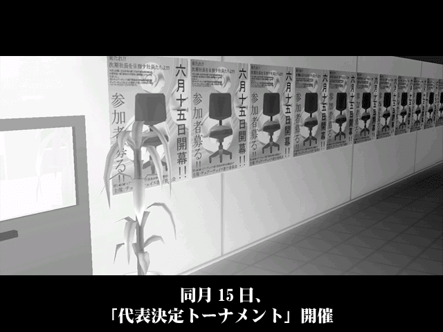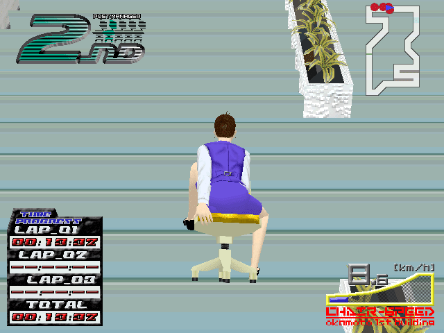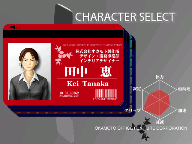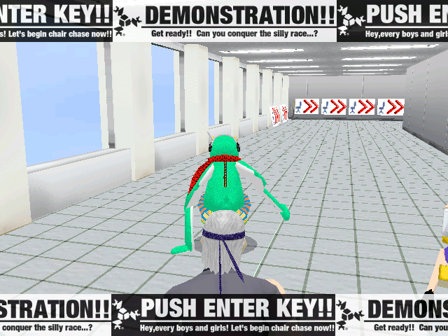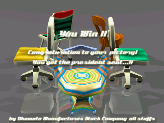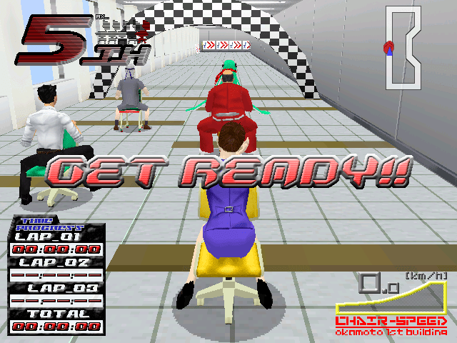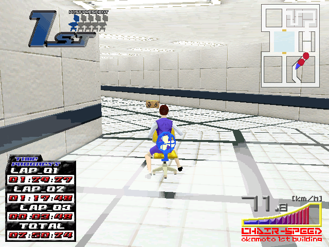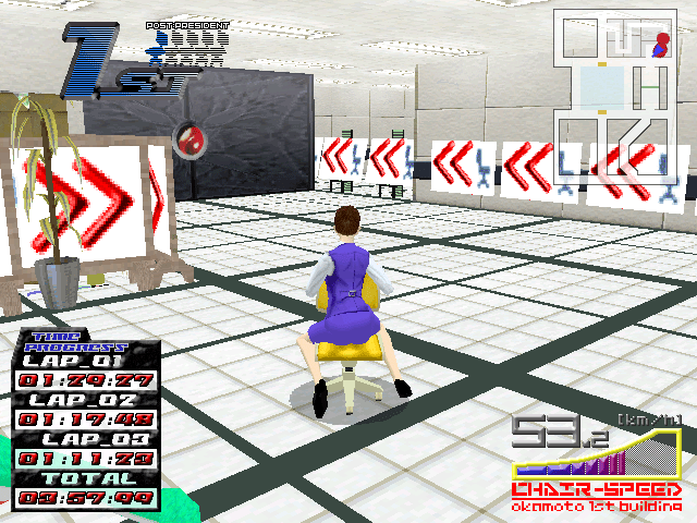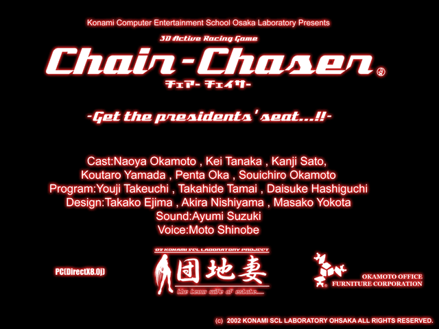 One of the most unique racing games you will ever come across, Chair Chaser is an intriguing freeware game from a team of students at Konami's computer gaming school in Japan's Osaka (which is Japan's equivalent of Digipen, except it has been around for much longer and is funded by a major game company). The game won the 4th CESA Award in 2002, and deservedly so. (CESA is short for the Computer Entertainment Supplier's Association - Japan's equivalent of the IDSA in the US). If you think you have seen everything there is to see in racing games, Chair Chaser will change your mind. Instead of racing expensive race cars, you race... office chairs. That's right: Chair Chaser brings to life one of the clandestine office sports that many people participate behind their bosses' backs. The game even has a wacky explanation of why you are doing this: a company has decided to appoint as its next president the winner of chair racing. Your goal, therefore, is to win all the races held on various office floors.