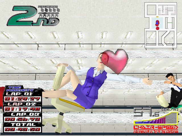 The game's graphics is not very detailed, but more than adequate and appropriately wacky. The actual gameplay is quite fun: you basically move the chair as quickly as possible by paddling with your legs, but you can also drop bombs and other obstacles to slow the other opponents down. Unfortunately, I found the game far too easy to merit a Top Dog tag, and there are some graphics glitches that mar the experience. The tracks are also too similar to each other, and once the novelty wears off, there is not much point to play the game again. But still, if you are looking for a very unique racing experience, you can't go far wrong with Chair Chaser. It is a pretty big download (90MB+), and it's all in Japanese, but you don't really need to understand the text, and the novelty is worth it. Here's hoping that some programmer would come along to take this wonderful concept to new heights - perhaps it won't be long until we see a more varied and more challenging version of this neat little underdog :)