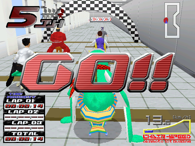 You first choose the character you want to play - ranging from a nerdy-looking guy, to a weird green penguin (how a penguin could manage a company I have no idea - but then again, this is the company that decided to pick its president from a wacky sport). Each character has different strengths and weaknesses. Once you are done, you are whisked off to the actual race - the maze-like corridors in an office. Like other racers, you are seated astride an office chair, relying only on your two legs and some devious tactics.