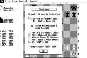 Pretty good chess game. This is one of (at least) four chess games by Chris Whittington released around 1990, all with almost identical look and feature sets. The other three are Chess Player 2150, Chess Champion 2175 and Chess Simulator. They mostly vary in name, with only small changes in color palettes, available piece sets, and slight changes in engine and opening books. Whittington is also known for the Superchess series on the ZX in the 80s, as well as Complete Chess System and Chess System Tal later in the 90s.