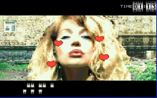 The goal is simple: rescue your girlfriend by defeating bullies. There are three bullies to choose from, all pretty dim-witted but differ in terms of speed or how many teeth they can knock off your mouth at a time. That's right, teeth: once you choose an opponent to beat up, you'll be thrown to a neat first-person perspective, with 2 rows of teeth at the bottom of the screen for you (32 total, of course), and another 2 rows for your opponent.