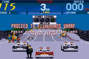 Cisco Heat is a dead average racing game in which you must beat the clock and reach the next checkpoint in time. You've also got to avoid trams and cars which might block your way. However, this is almost impossible to do, since the collision detection is truly abysmal-- you often find yourself colliding into invisible police cars and trams that are on the other side of the road. As a result, you will often run out of time and can't reach the next stage.