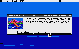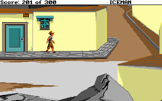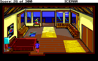 The most aggravating sequence in the game is the dice game you must play against a crewman to get the item you need. Here, in one of the worst design decisions I've seen, Sierra decided to make the game un-savable -- even if you save during the dice game, restoring will always put you back to the point before the game starts (with taunting remarks from the game). Because the dice game is long, and there is a lot of luck involved, this design choice just makes the game very aggravating (I actually experienced a game-killing bug after I tried to save during the game too many times).