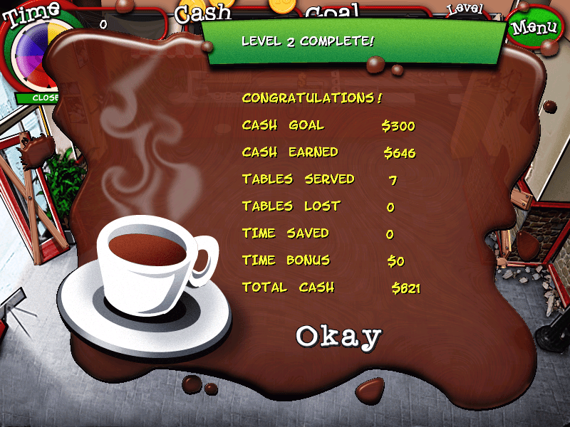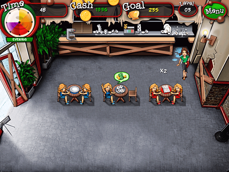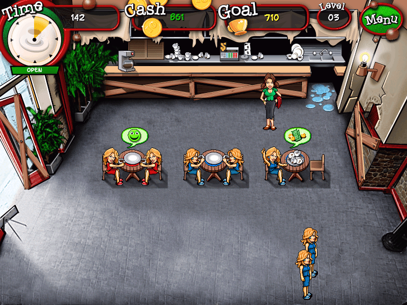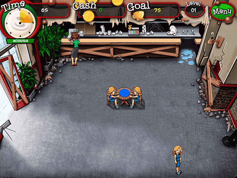 Here is the video game “Coffee House Chaos”! Released in 2005 on Windows, it's still available and playable with some tinkering. It's a simulation game, set in an arcade and managerial themes.