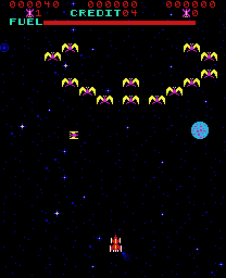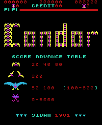 Here is the video game “Condor”! Released in 1980 on Arcade, it's still available and playable with some tinkering. It's an action game, set in an arcade, sci-fi / futuristic and shooter themes.