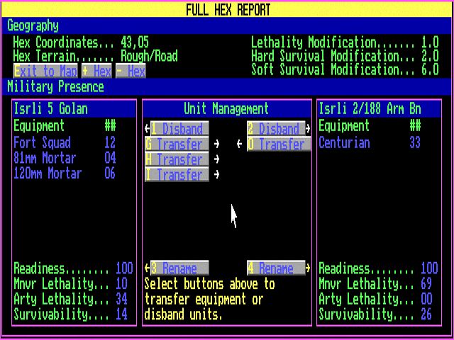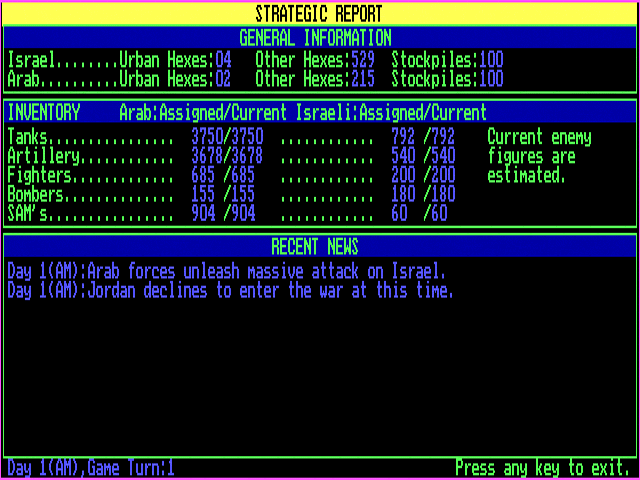 "A serious simulation of the 1973 Yom Kippur War and a future Arab-Israeli War, this product was very detailed. Mouse implementation is is much easier than the designer's last design (Red Lightning), but it still required much time and thought. Recommended for the serious aficionado." [excerpt from M. Evan Brooks' Homepage]