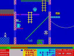 Here is the video game “Costa Capers”! Released in 1986 on ZX Spectrum, it's still available and playable with some tinkering. It's an action game, set in an arcade and platform themes and it was released on Amstrad CPC as well.