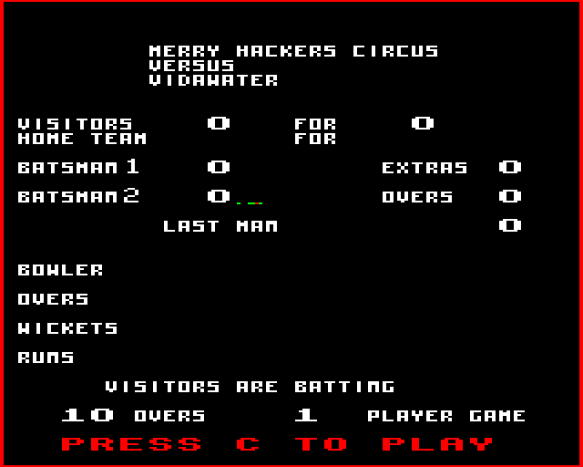 1986, the year Cricket was released on Electron. Published by Bug-Byte Software Ltd., this sports game is available for free on this page.