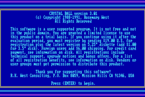 1988, the year Crystal Ball was released on DOS. Made by R.K. West Consulting and published by Digital Horizons, this simulation game is available for free on this page.