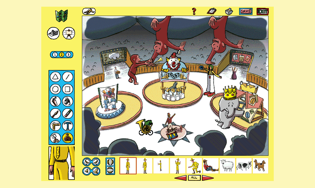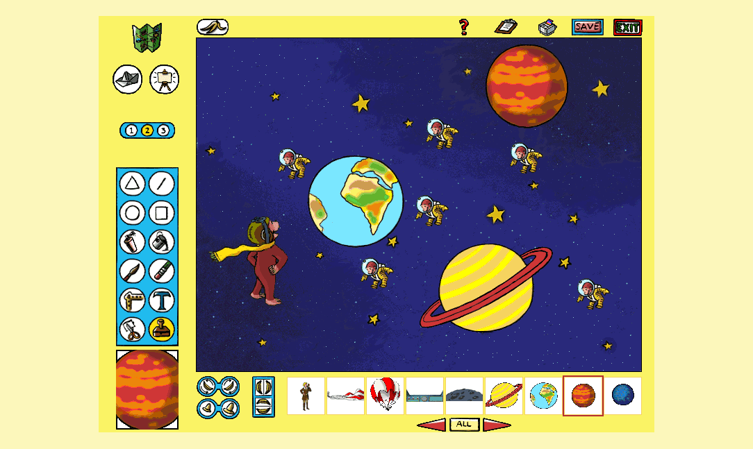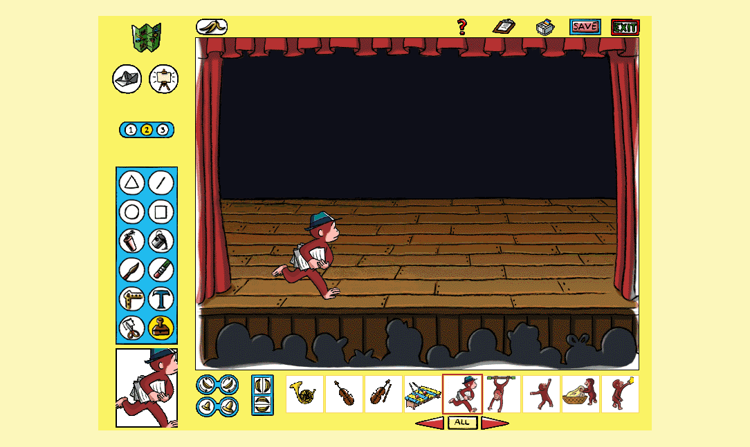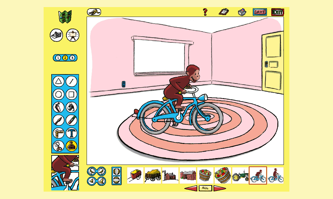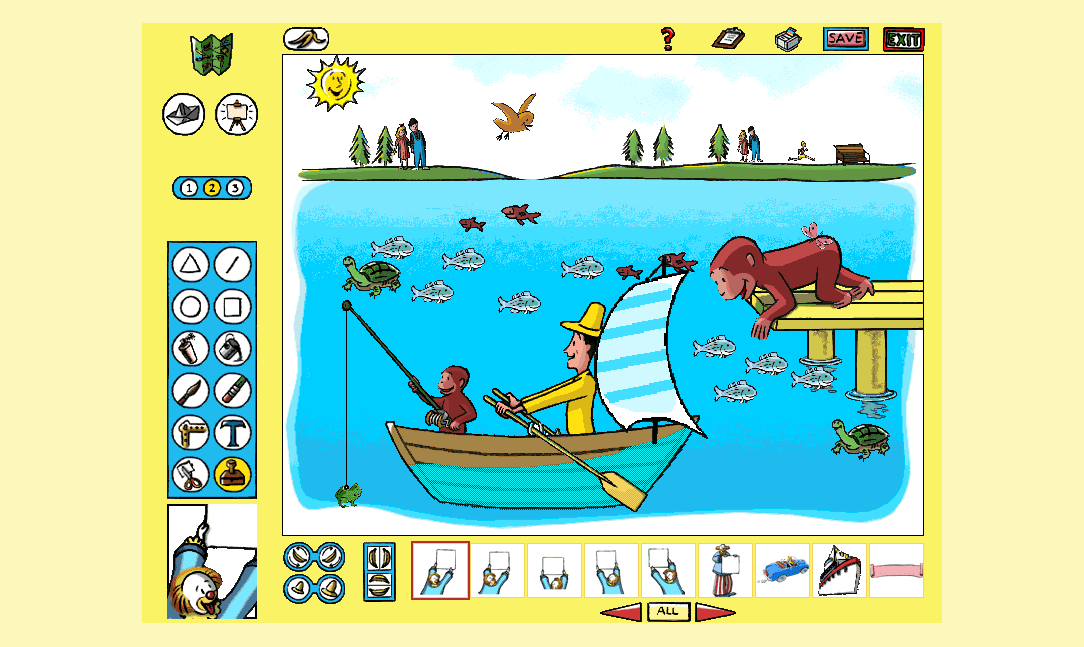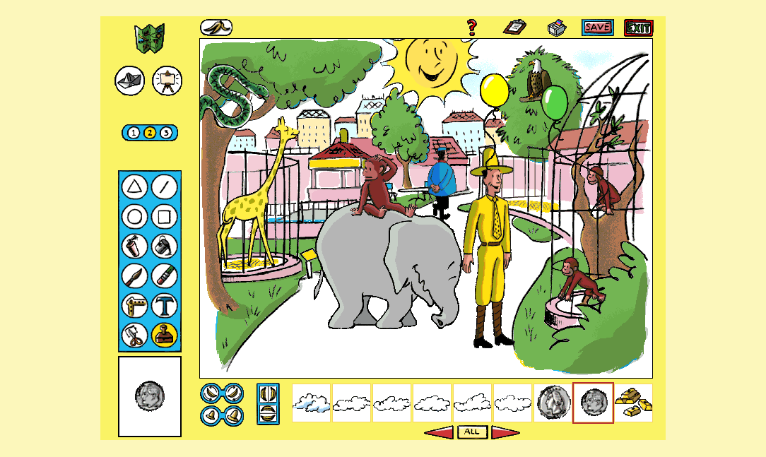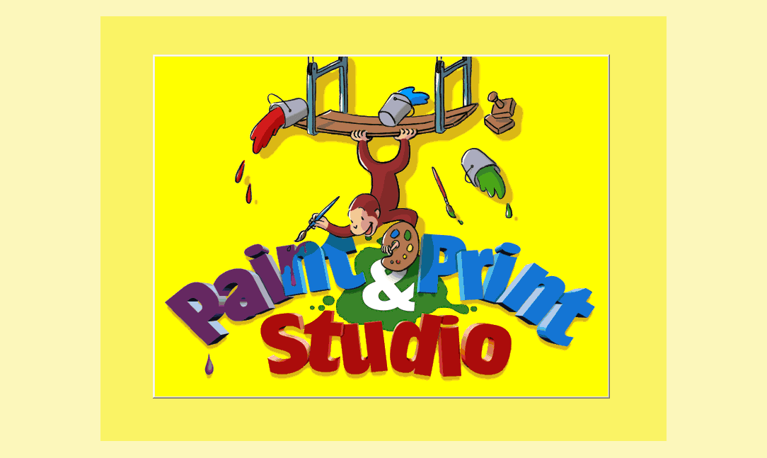Here is the video game “Curious George Paint & Print Studio”! Released in 1998 on Windows, it's still available and playable with some tinkering. It's an educational game, set in a licensed title theme.