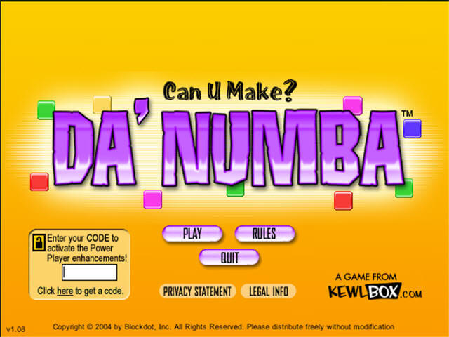 2004, the year Da Numba was released on Windows, as well as Mac. Made by Blockdot, Inc. and published by Kewlbox, this puzzle game is available for free on this page.