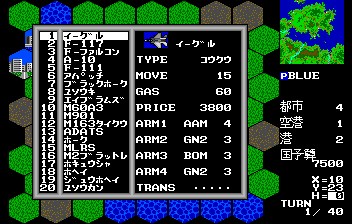 The Sharp X68000 version is the best. Similar to the PC-98 but you get much better sound effects with the X68k relative to beeps on the PC-98. And to my eyes, the interface is cleaner, and much better editor functionality. The campaign requires creating a User Disk, a bit fiddly but manageable. Also, there are many extra map disks and the ability to load/edit maps from other Daisenryaku games. With the Unit Editor (Abba) it is possible to completely customize your armies. The only drawback of Campaign Version is the rather stupid AI.