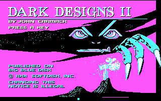 In and of themselves, both Dark Designs have nothing special-- typical fantasy plot, monsters, and a user interface that Ultima fans will be familiar with. Rather, the games' strongest appeal -- and the fact which assures their place in gaming history-- is the fact that they were both designed by now-famous John Carmack, back when he was employed by SoftDisk, months before he formed id Software with his brother Adrian and John Romero.