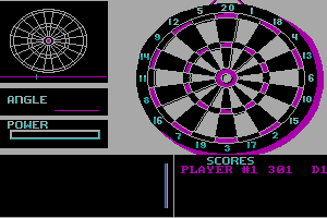 Here is the video game “Darts”! Released in 1989 on DOS, it's still available and playable with some tinkering. It's a sports game, set in a darts / target shooting theme.