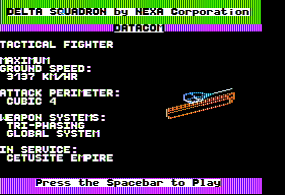 Delta Squadron is a video game published in 1983 on Apple II by Nexa Corporation. It's a strategy game, set in a sci-fi / futuristic, turn-based and wargame themes.